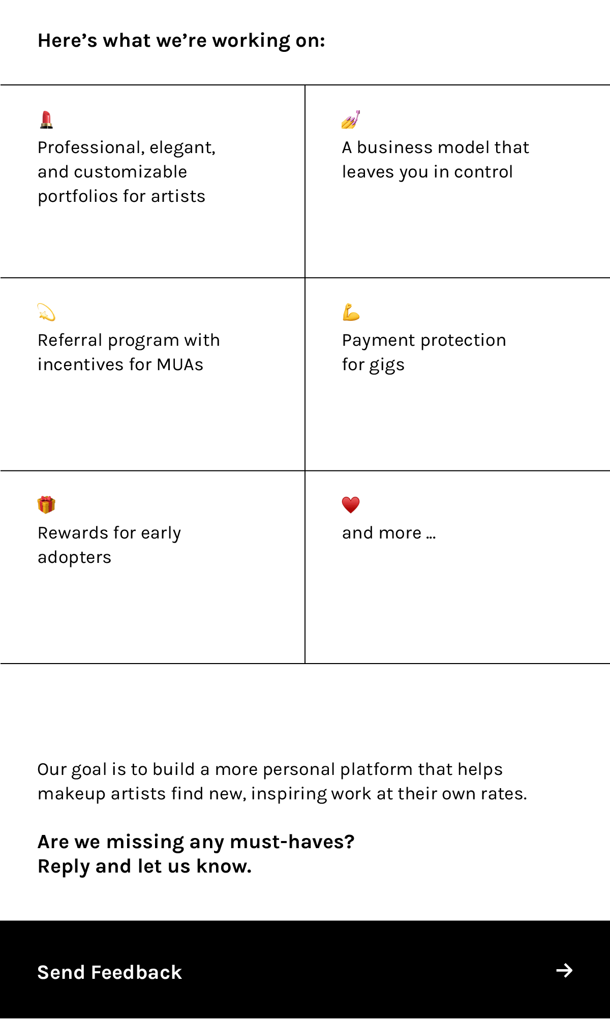 Developed the brand for a platform that empowers makeup artists. Conducted competitor analysis, market research and audience interviews alongside UX and graphic designers. Delivered pitch deck for investors, value proposition, brand guidelines, and website copy.